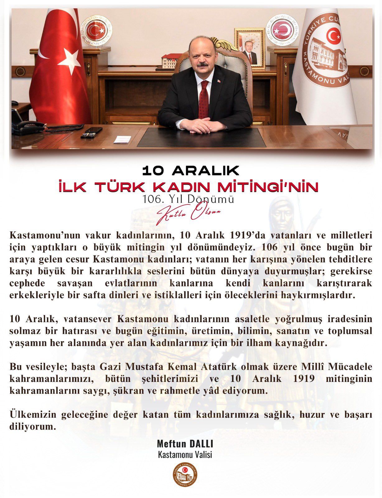 “Kastamonu’lu kahraman kadınlarımız, 10 Aralık 1919 tarihinde düzenledikleri büyük mitingde vatan topraklarının işgaline karşı bağımsızlık iradesini dünyaya haykırmıştır.