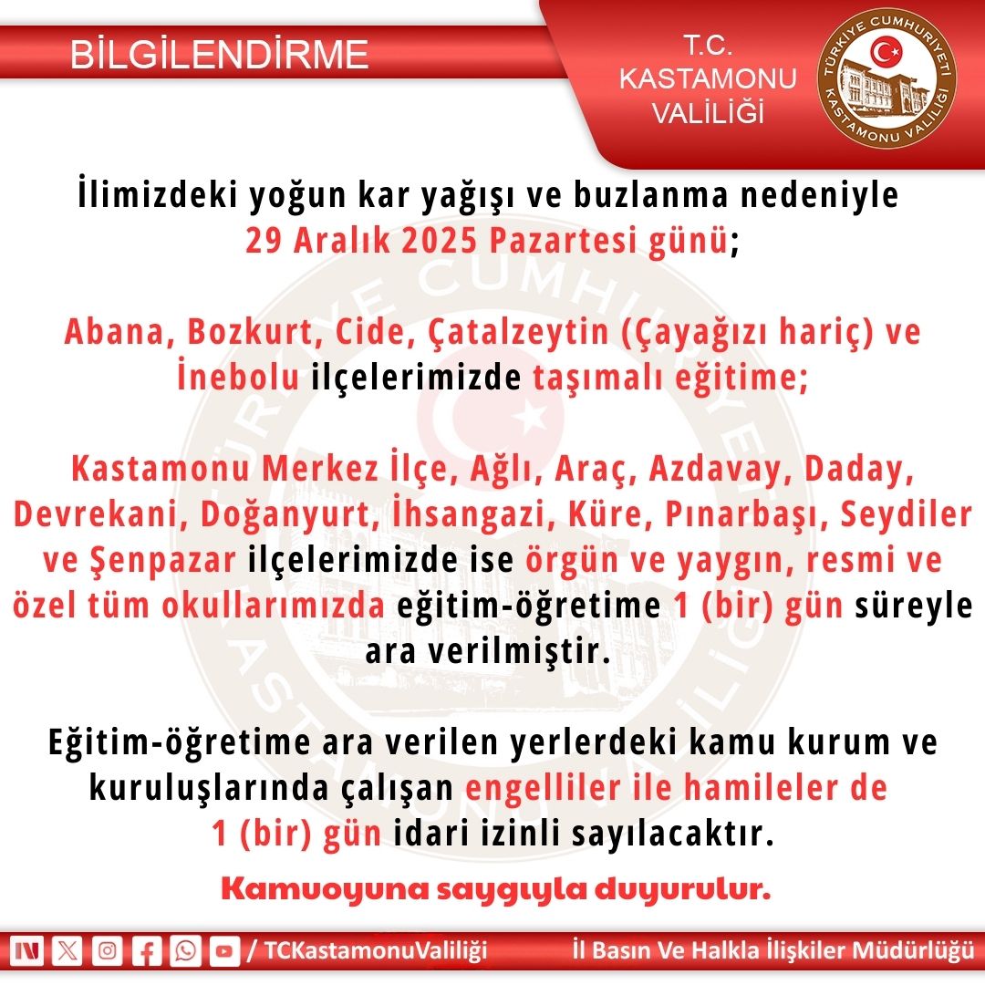 Valilik bilgilendirmesinde ayrıca, Kastamonu Merkez ilçe başta olmak üzere çok sayıda ilçede örgün ve yaygın eğitim ile resmi ve özel tüm okullarda eğitim-öğretime 1 (bir) gün süreyle ara verildiği duyuruldu.