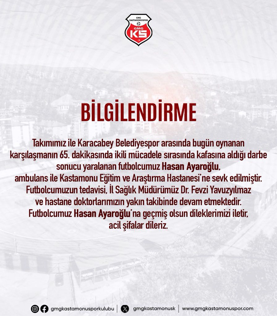 GMG Kastamonuspor’un golcüsü Hasan Ayaroğlu, Karacabey Belediyespor maçında sakatlanarak hastaneye kaldırıldı. Maç 2-1 kazanıldı. Futbolcunun tedavisi yoğun bakımda sürüyor.